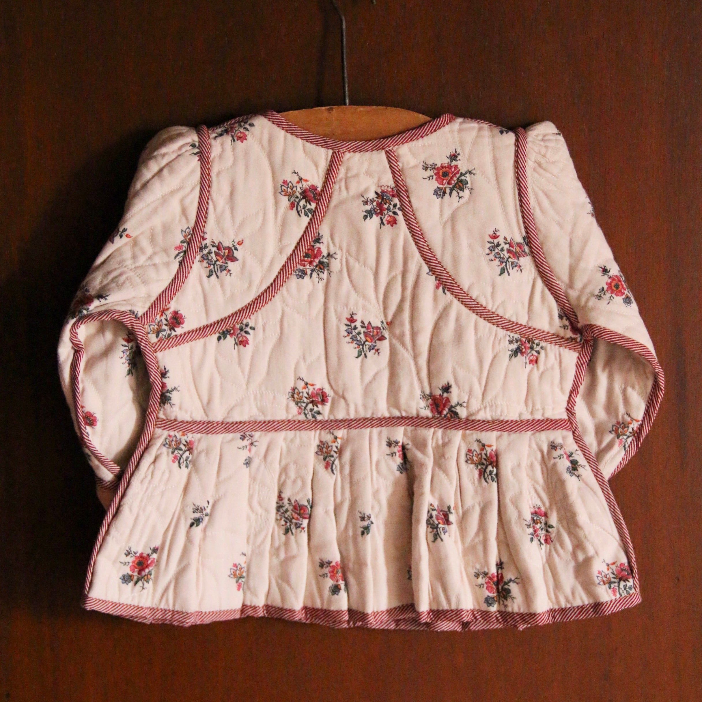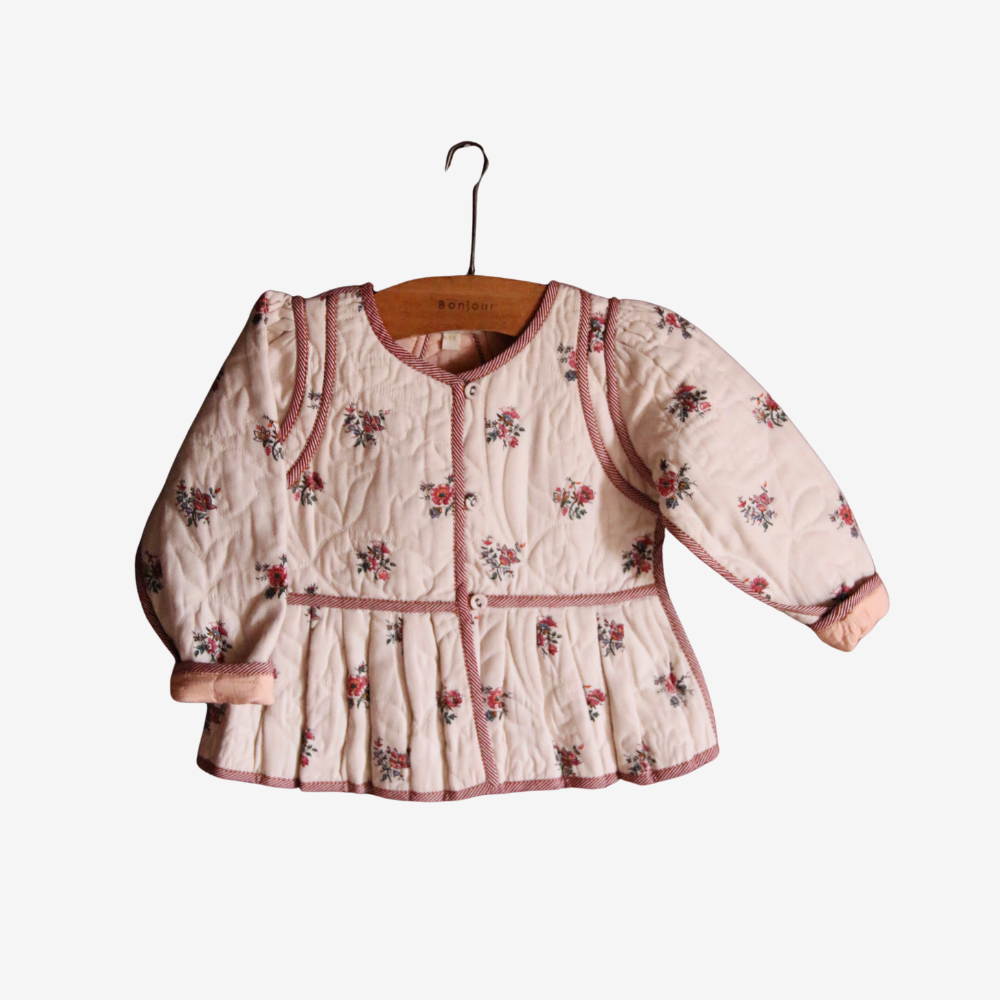 Bonjour Diary Quilted jacket, Denim Garden flowers print Red stripe print piping