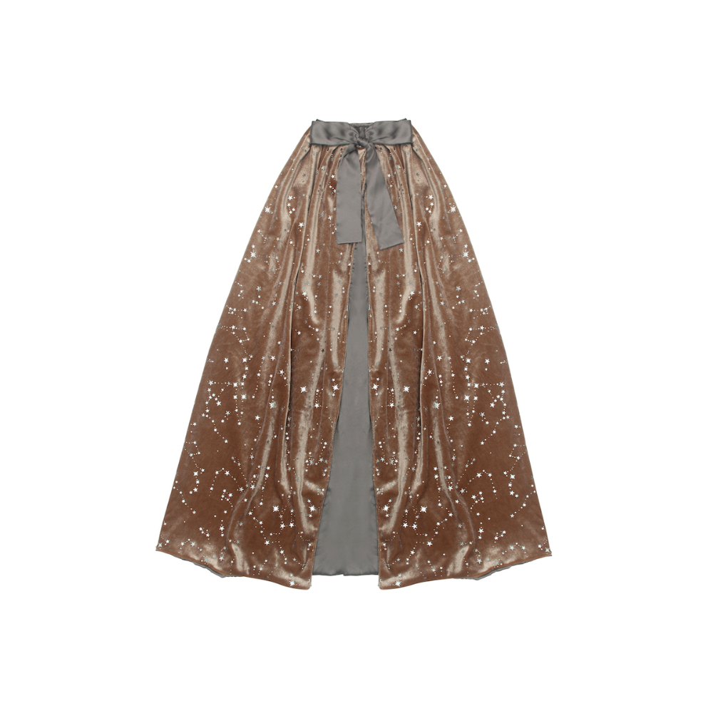 Super soft velvet embellished with constellations of silver stars, featuring a soft grey satin bow and lining