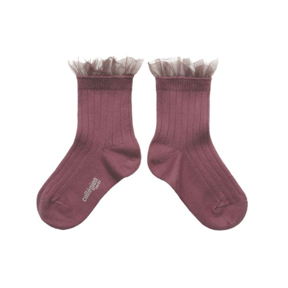 Tinyapple | Collégien | Margaux Tulle Frill Ribbed Ankle Socks, Raisin Rose