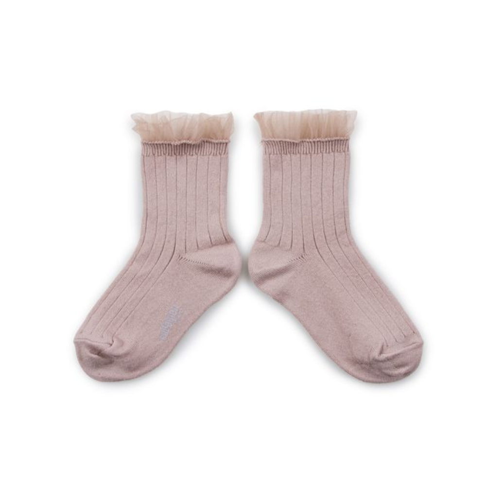 Tinyapple | Collégien | Margaux Tulle Frill Ribbed Ankle Socks, Vieux Rose