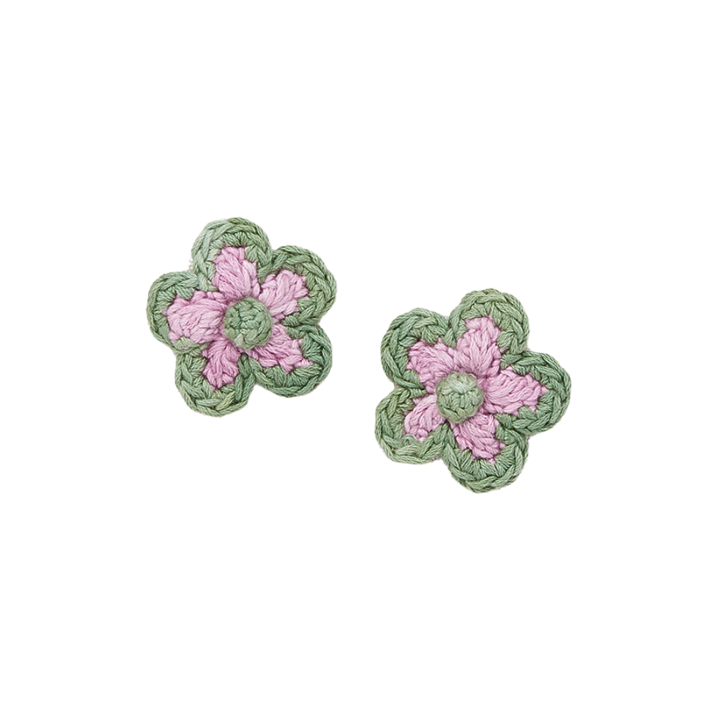 A two-color hand-crocheted flower set on alligator clips in Pima cotton.