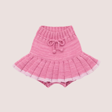 A hand-knit skirt in Pima cotton, featuring contrast striped trim, attached bloomers with ribbed cuffs and a ribbed waistband with a popcorn-tie drawstring for a secure fit.
