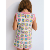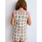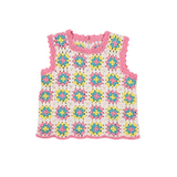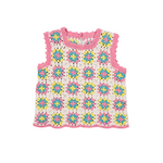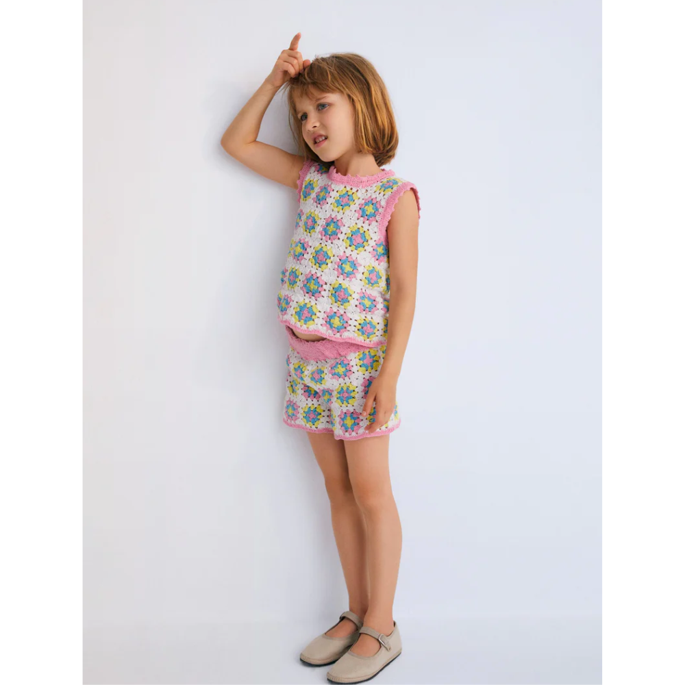This colorful crochet top is the perfect summer staple, featuring intricate handmade details and a vibrant design. It has a back opening with delicate crochet buttons and curved pink trimmings on the armholes and hem for a playful touch. Pair it with the matching shorts for a coordinated, effortlessly chic look.