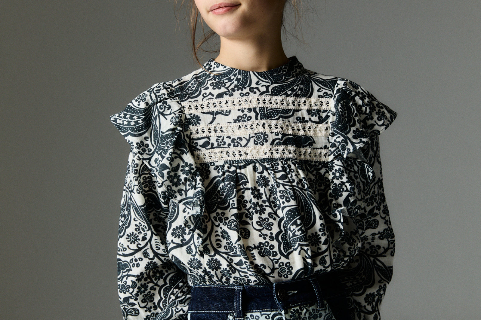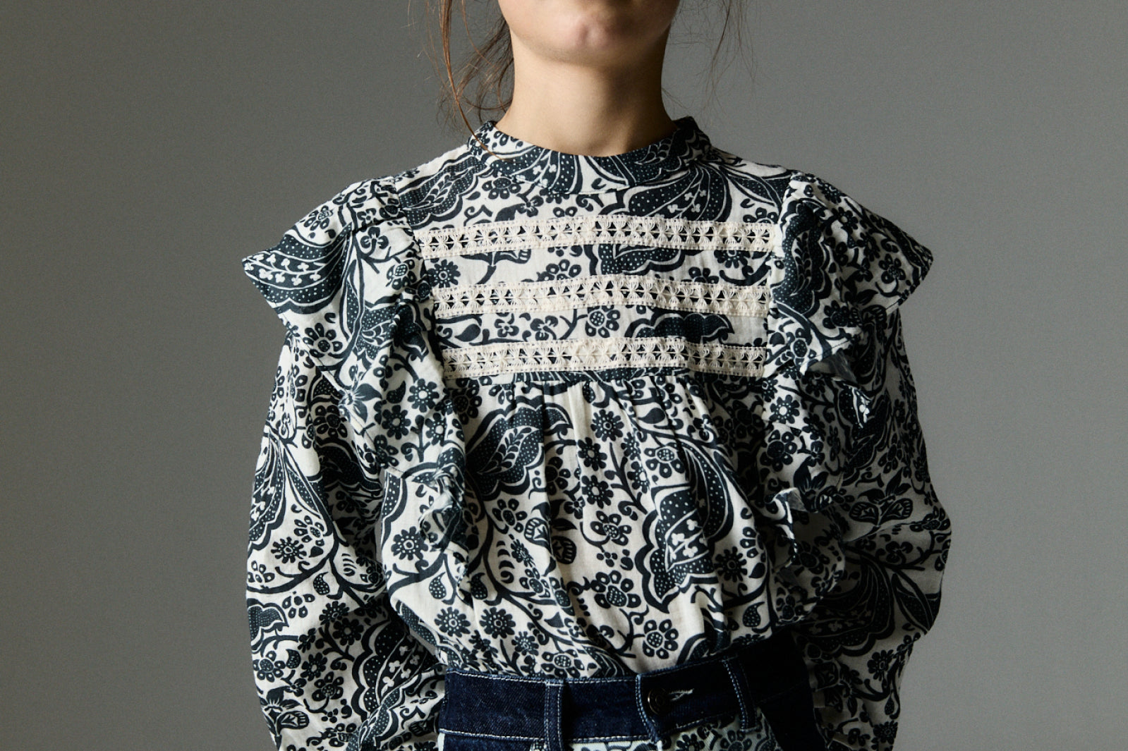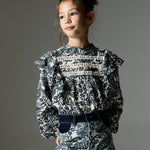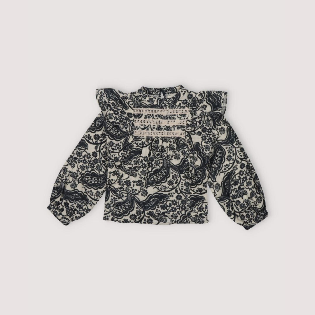 Jaipur blouse our exclusive 'Majestic Paisley' print and colors from the collection. It stands out with two front ruffles and three lace ribbons matching the background. Sleeves with gathered cuffs.