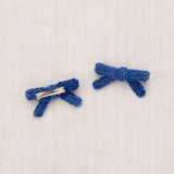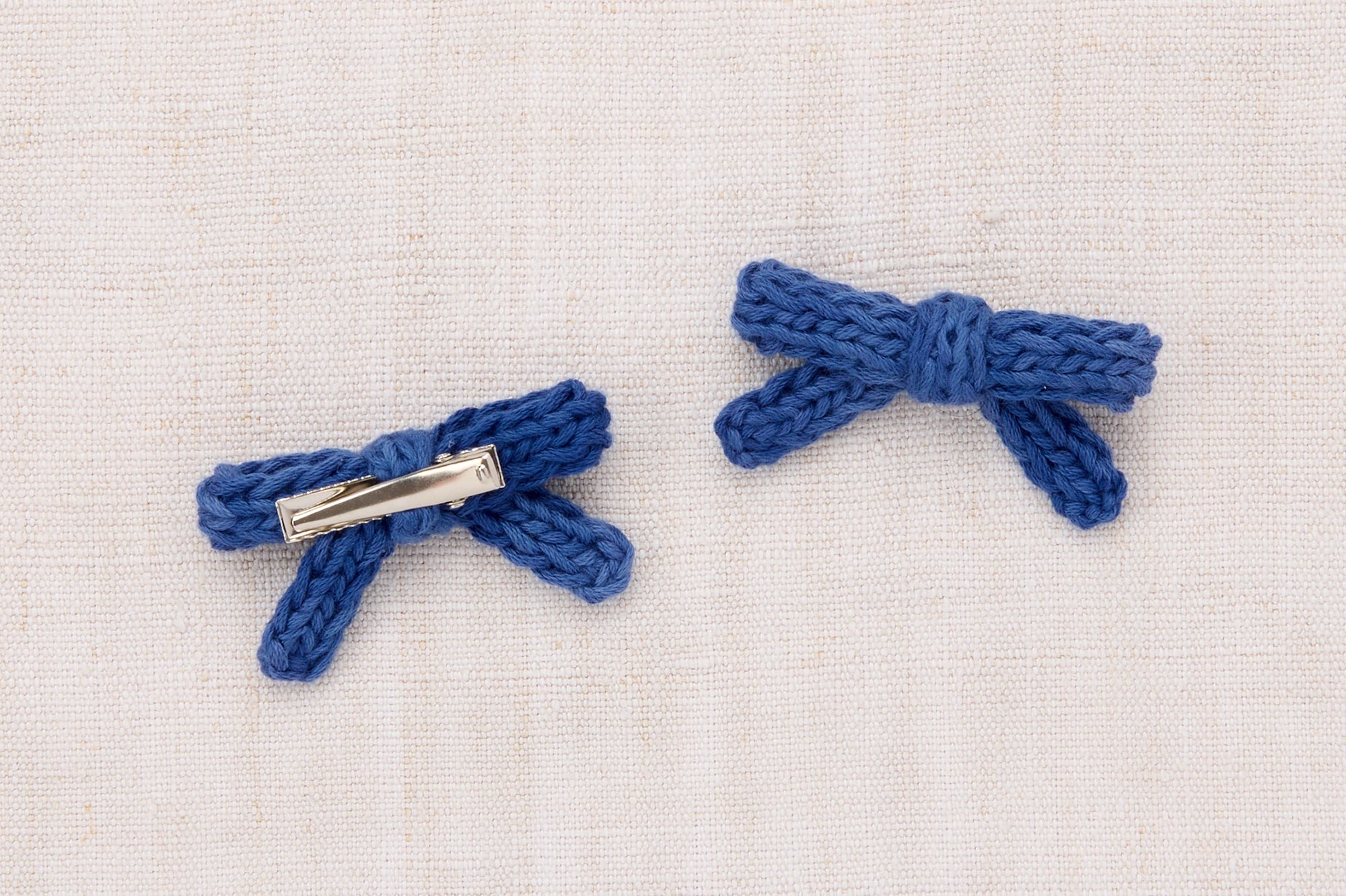 A set of hand-knit slim bows on alligator clips in Pima cotton. For matching your favorite knitwear, adding a pop of color, or gifting to a friend.
