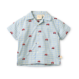 The Albert Shirt is made in light blue gingham with a cute embroidered car pattern. The shirt has a collar and a front closure with mother-of-pearl buttons.