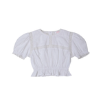 A sweet blouse with short, puffed sleeves and delicate lace trim details. It features back button closures for easy wear and a stretchy waistband for a comfortable fit.