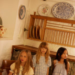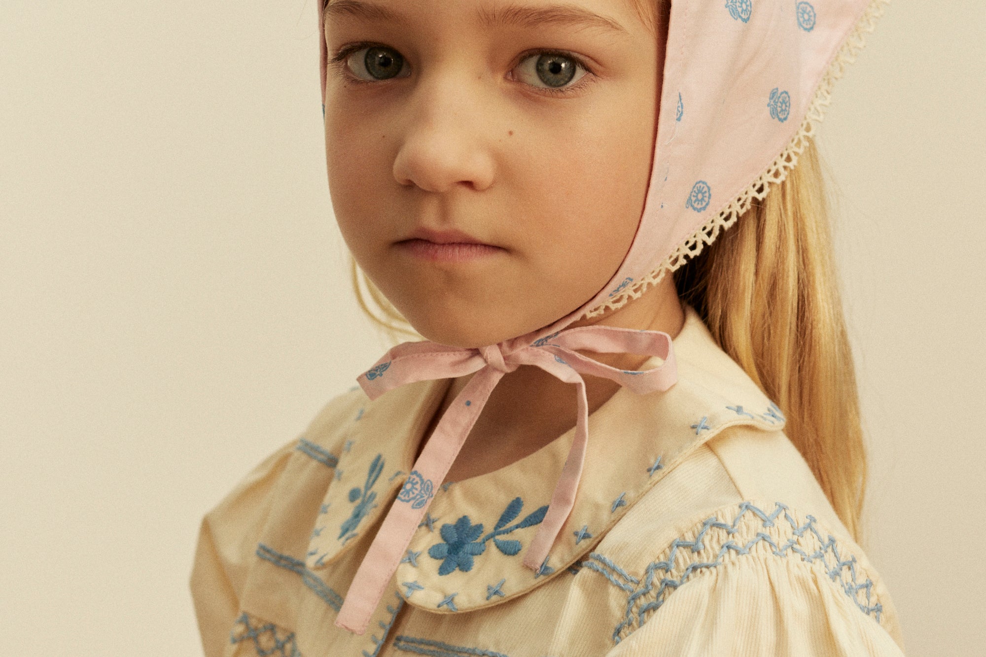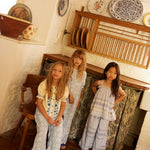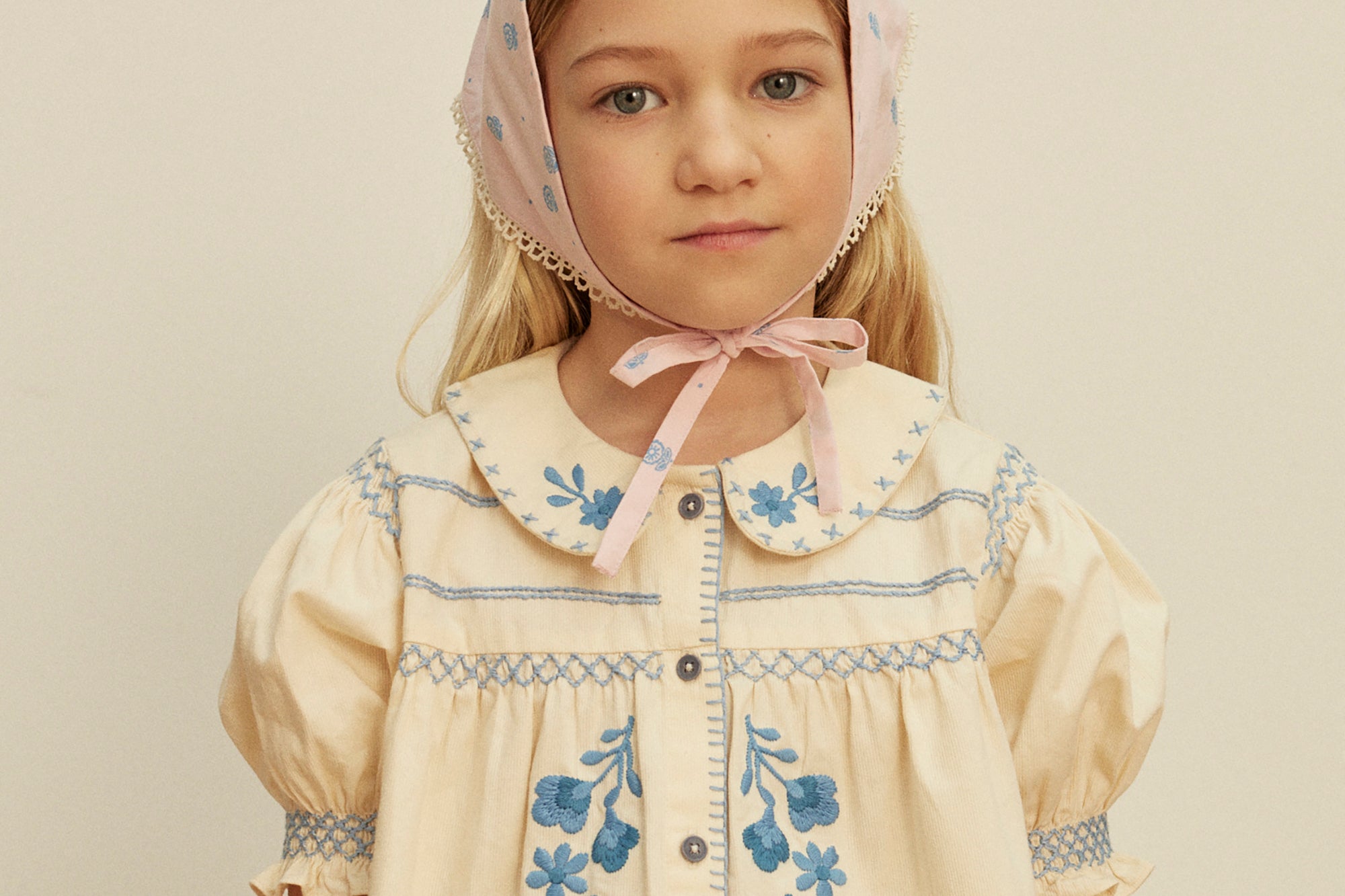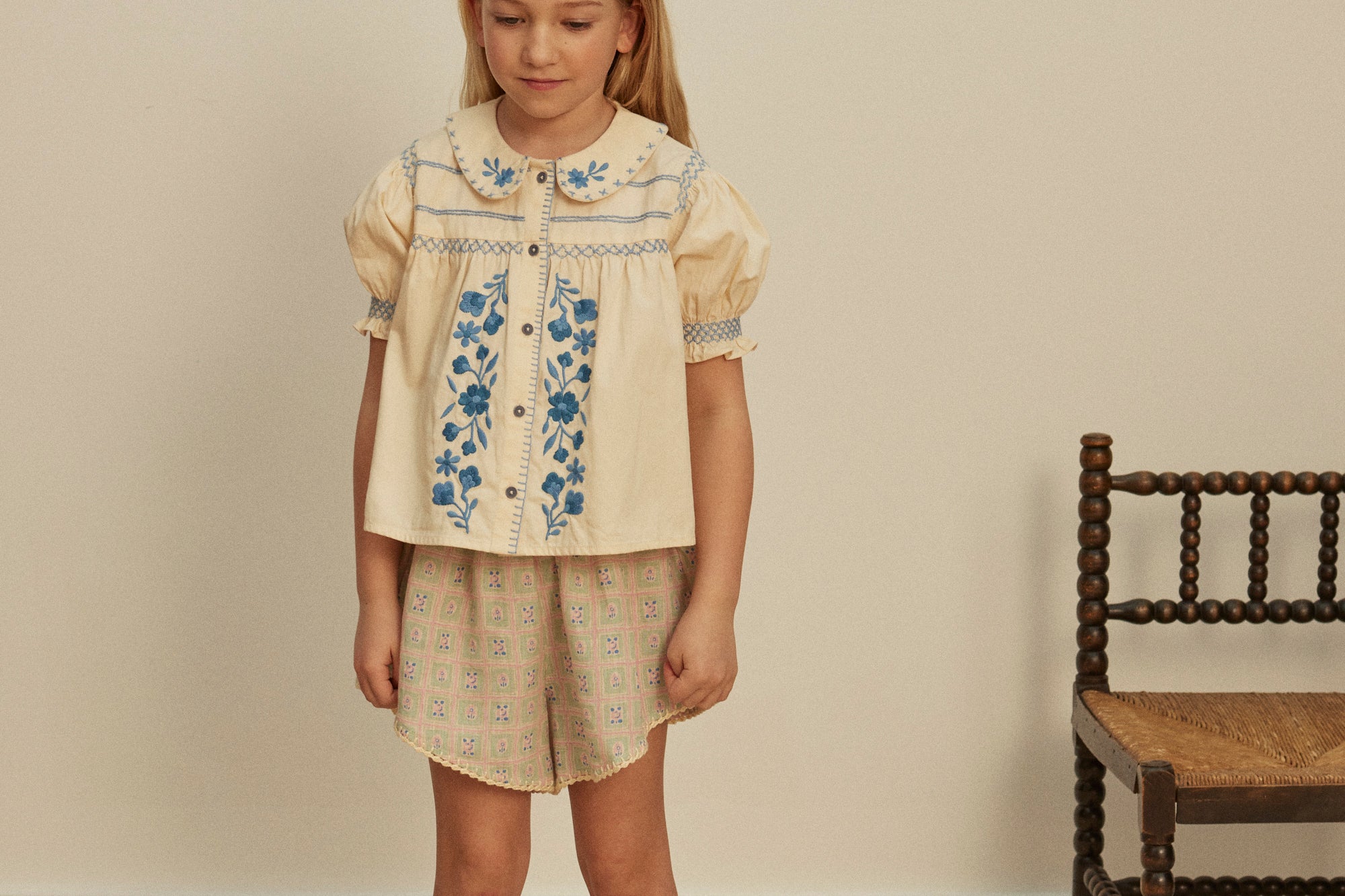 The pretty vintage-inspired Heidi blouse comes in our ‘cream’ structured self stripe cotton with contrast tonal blue handworks for a folk mood. Featuring bold floral embroideries at placket and collar, cross stitch finish at collar, hand smocking at shoulder, sleeve and chest, and blanket stitch finish at placket. Button through front. Heidi looks lovely worn with our Wini trousers or Casey jeans.