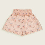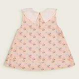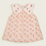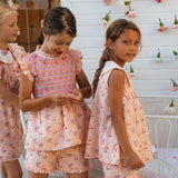 Blouse & Shorts set, 100% organic cotton, Plain lining in organic cotton, Block print, Hand embroidery on the collar, Golden piping on the front, Smocks at the waist, Ruffles on leg openings and collar, One buttoned drop at the back.