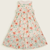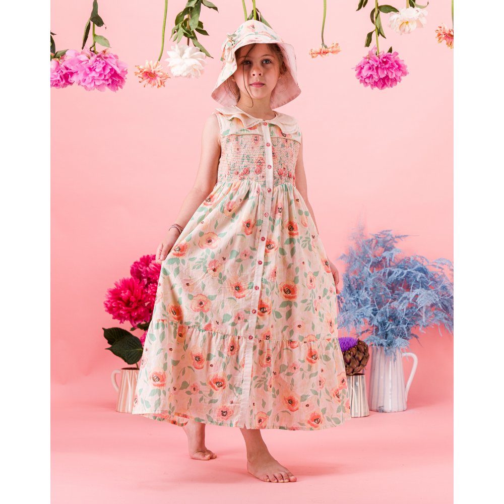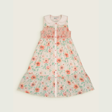 A sleeveless long shirt dress in organic cotton, featuring a double Peter Pan collar with lace finishing and a beautifully smocked front yoke delicately adorned with floral hand embroidery and finished with golden piping.