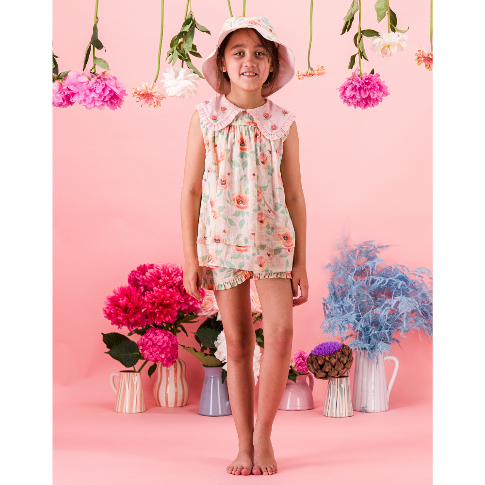 A blouse and shorts set in organic cotton with hand embroidery on the collar.