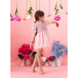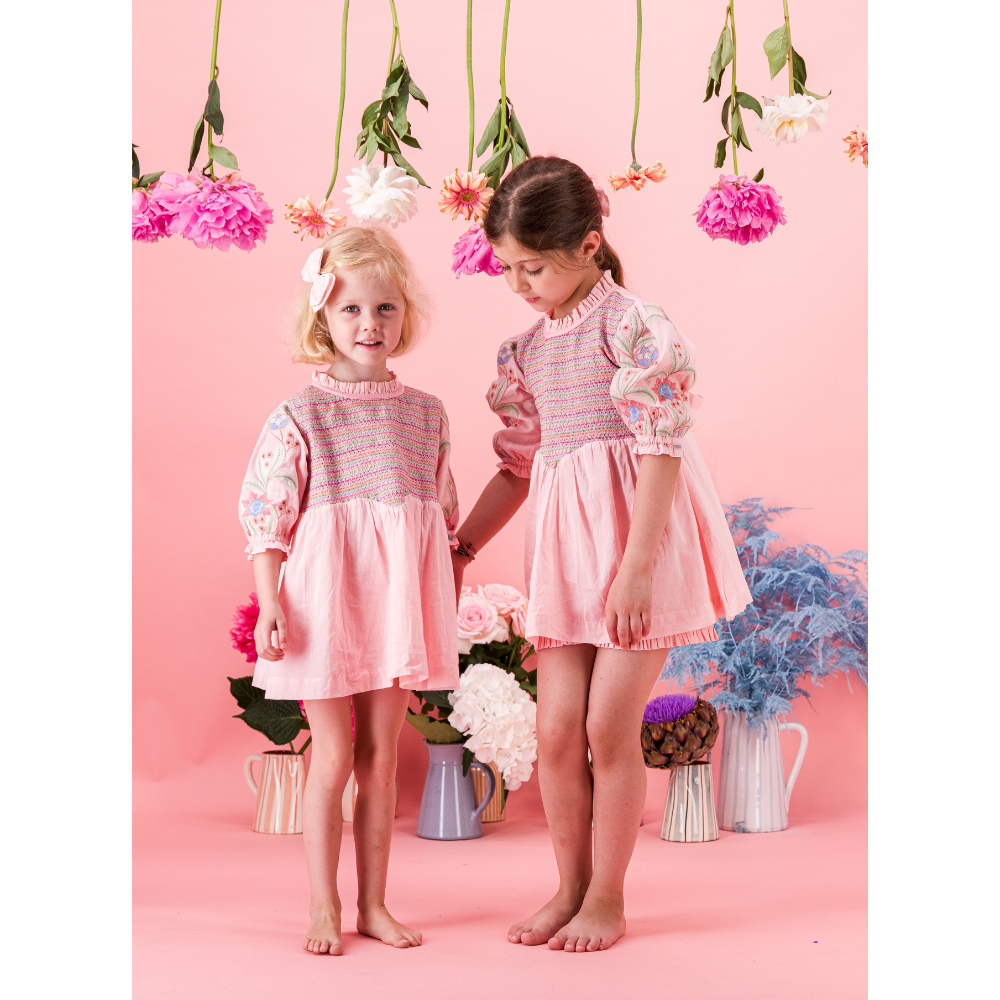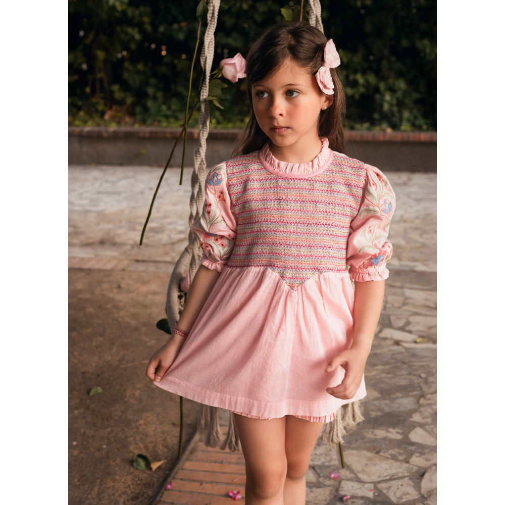 Blouse/Short dress, Old pink color, 100% organic cotton, Plain lining in organic cotton voile, Three-quarter embroidered and elasticated sleeves, Smocks on the chest, Ruffle on the collar, Tone-on-tone buttons and belt at the back.