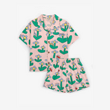 A comfy classic with a playful twist! This pink loungewear set, made from 100% organic cotton, includes a short-sleeve button-up shirt with embroidery and relaxed shorts.