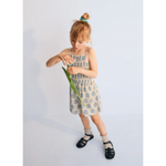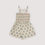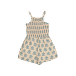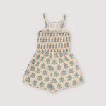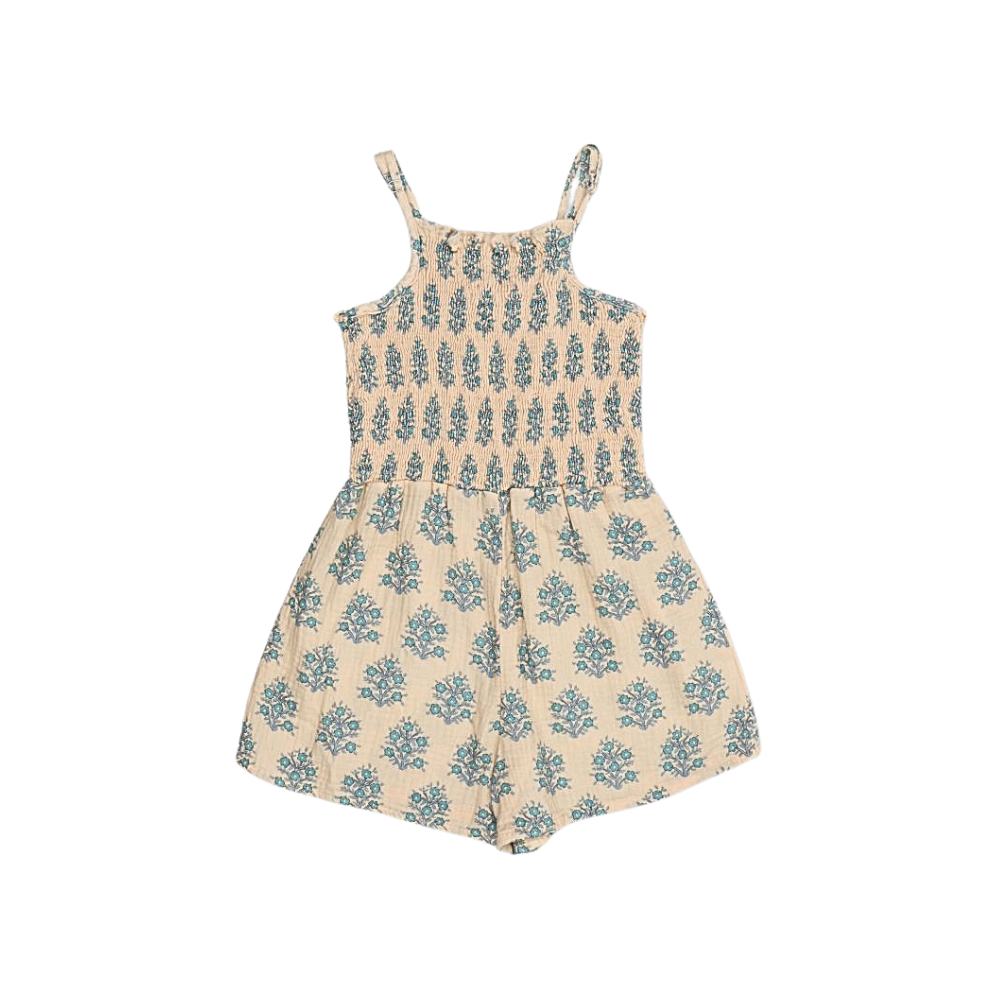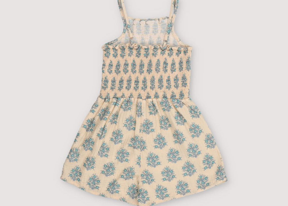 Kyra Jumpsuit in muslin fabric with our Lavender print, offering a relaxed yet stylish silhouette. The smocked top provides a flattering fit, while the gathered pants create a charming smocking effect at the waist. Perfect for warm days and easygoing adventures, this jumpsuit combines comfort and style effortlessly.