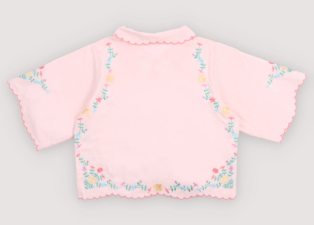 Fine, soft cotton blouse with short sleeves and a beautiful neckline. It features colorful floral embroidery details and embroidered finishes. It has a front opening with ties made from the same fabric.