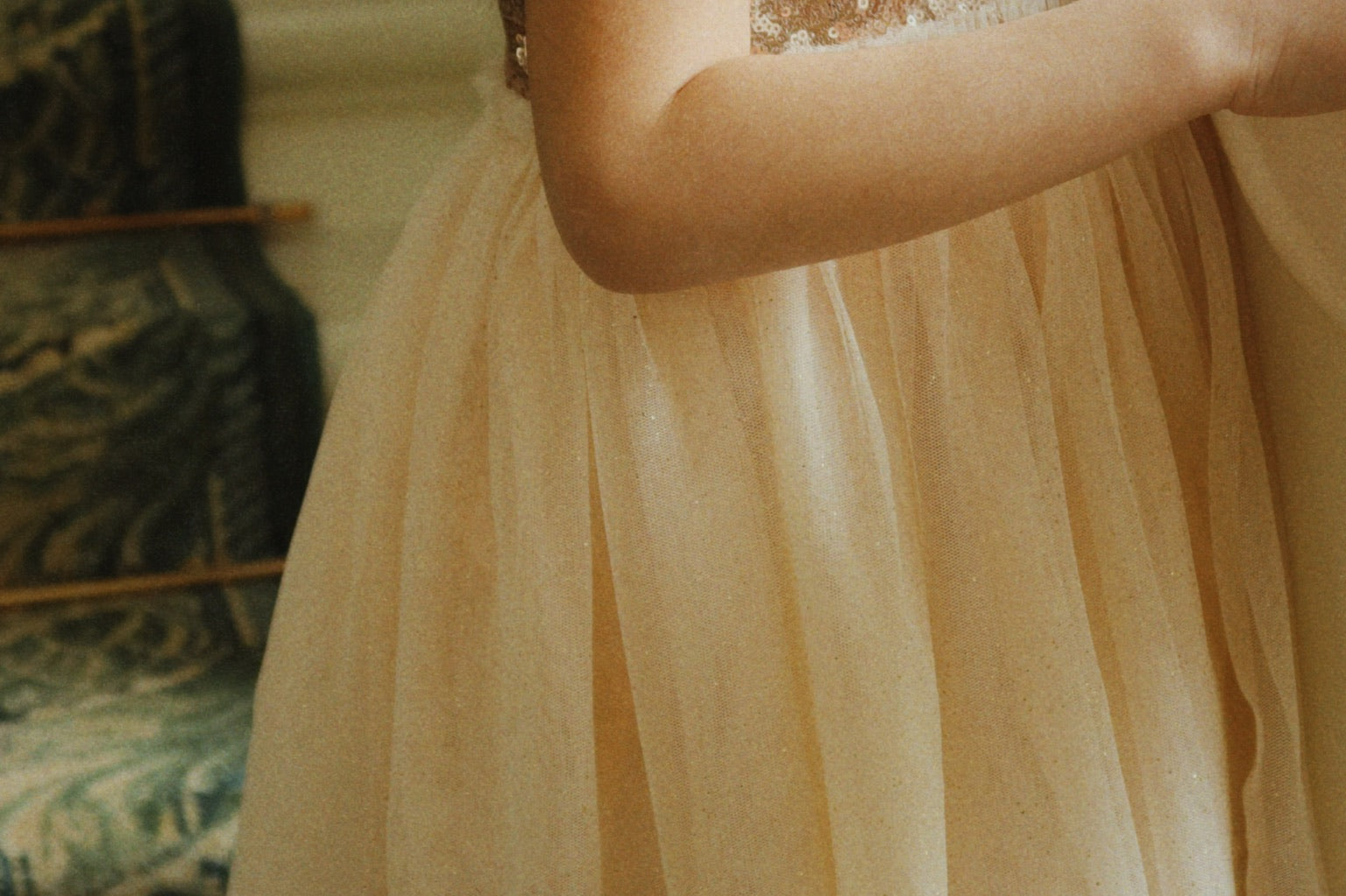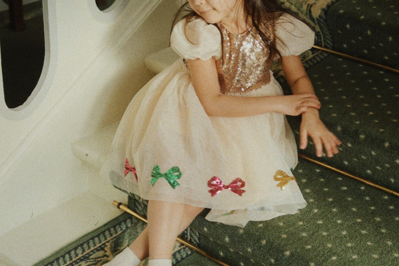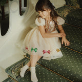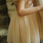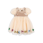 Puff sleeve dress with a sparkly sequin bodice and layered tulle skirt. A festive favorite that is fit for all occassions. Designed with a button closure in the back and a soft cotton lining.