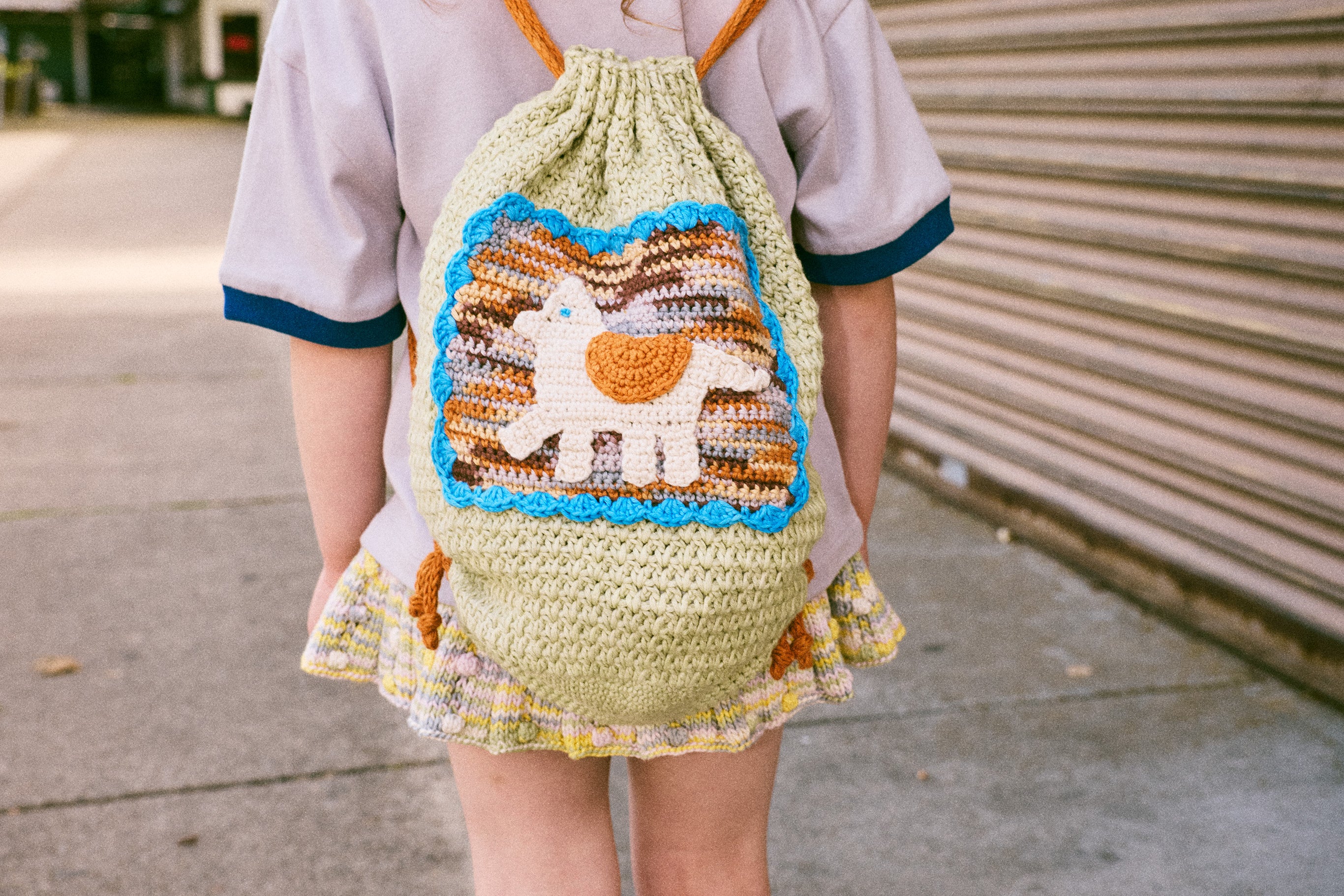 A hand-crocheted drawstring bag in Pima cotton, featuring two straps for carrying and finished with a hand-crocheted appliqué motif.