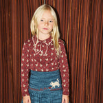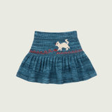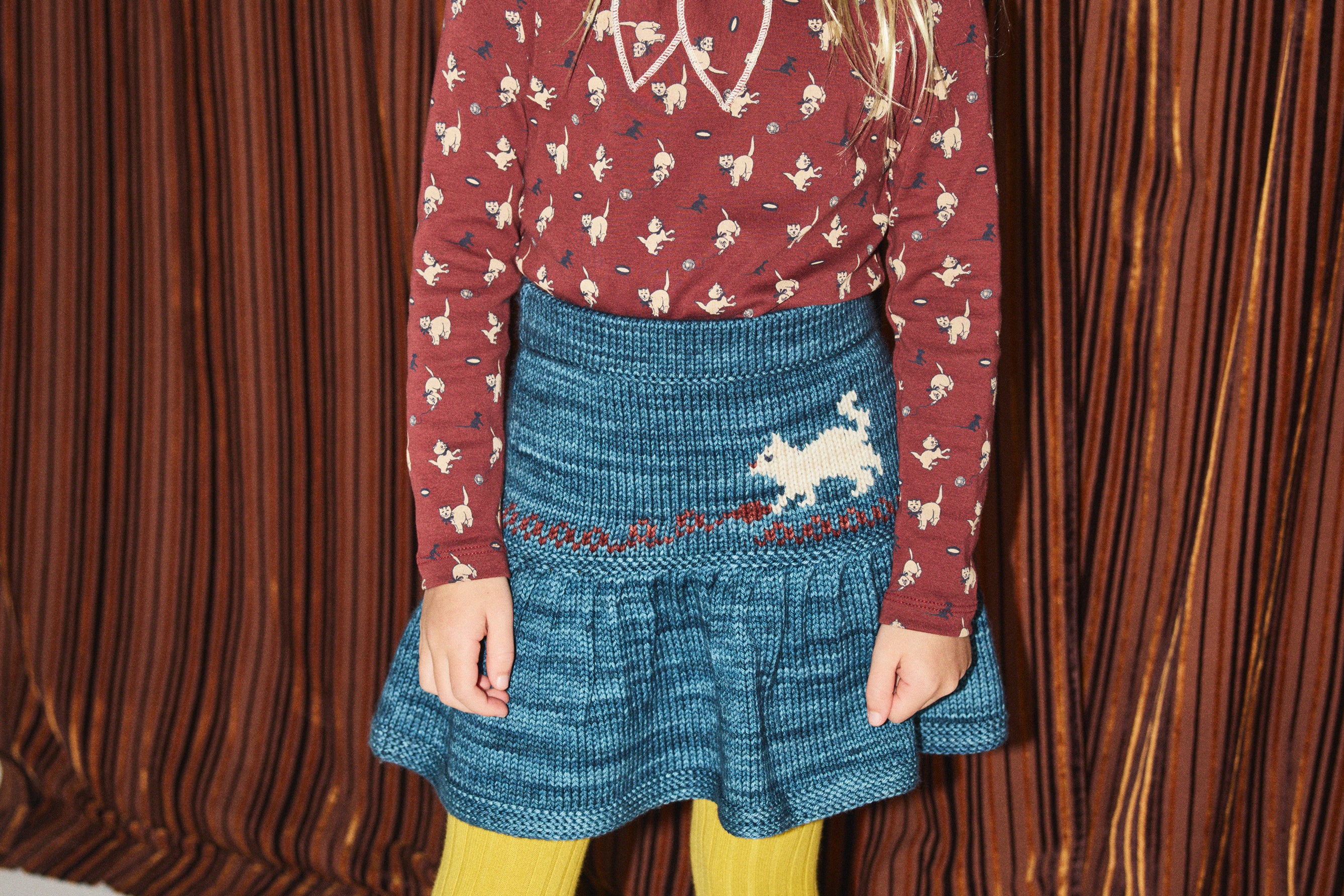 | Tinyapple | FW25 Winter Misha & Puff | Kitten Tangle Skirt, Blue SmokeA skirt in Merino wool, featuring a skating silhouette, an intarsia kitten and yarn motif, and soft banded elastic waistband.100% Super Wash Merino WoolK1236W25-469