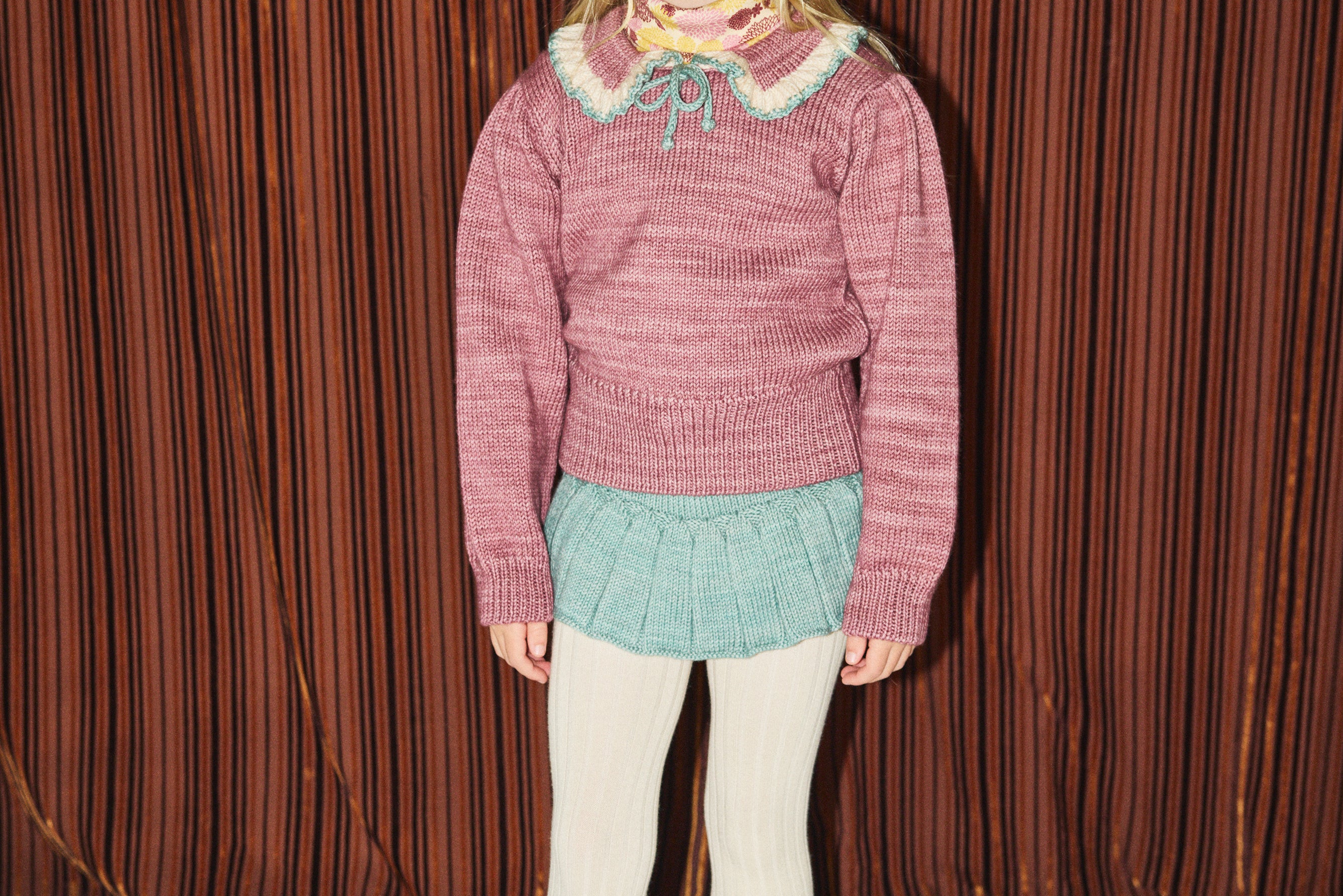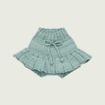 A hand-knit skirt in Merino wool, featuring attached bloomers with ribbed cuffs and a ribbed waistband with a popcorn-tie drawstring for a secure fit.