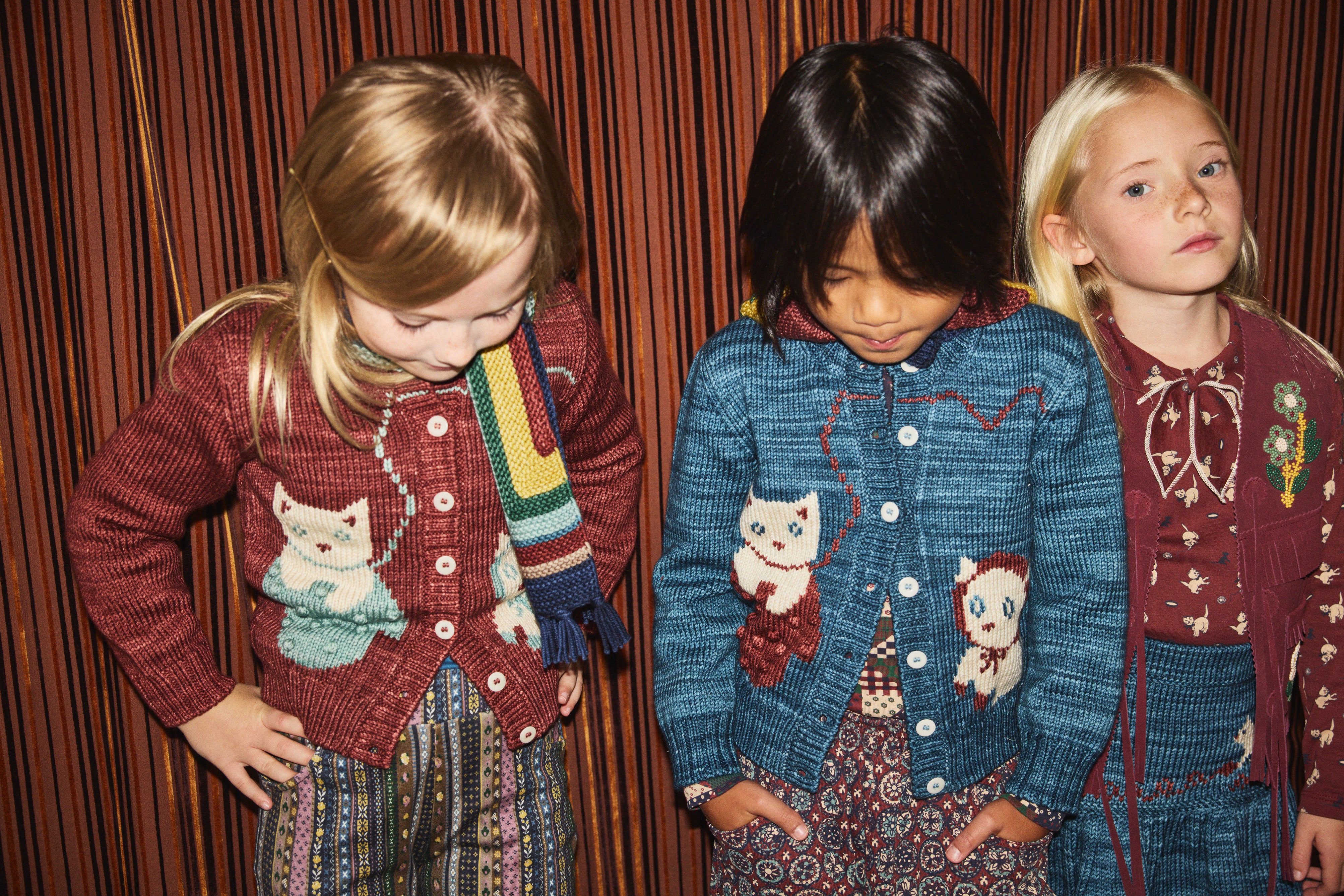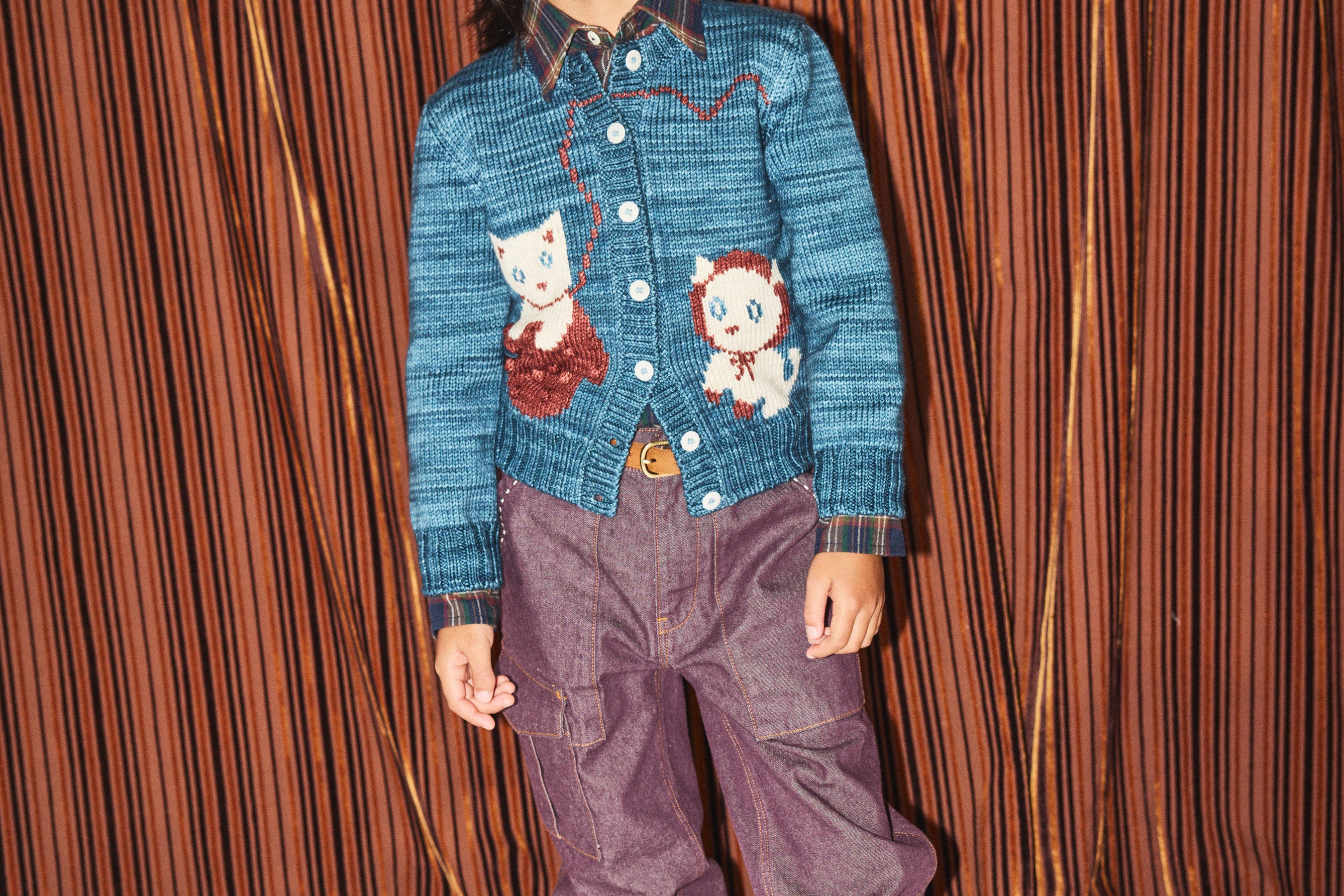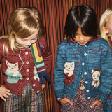 A classic cardigan in Merino wool, featuring a kitten motif intarsia with hand-worked popcorn stitch detail, ribbed trim, and corozo button closure.