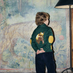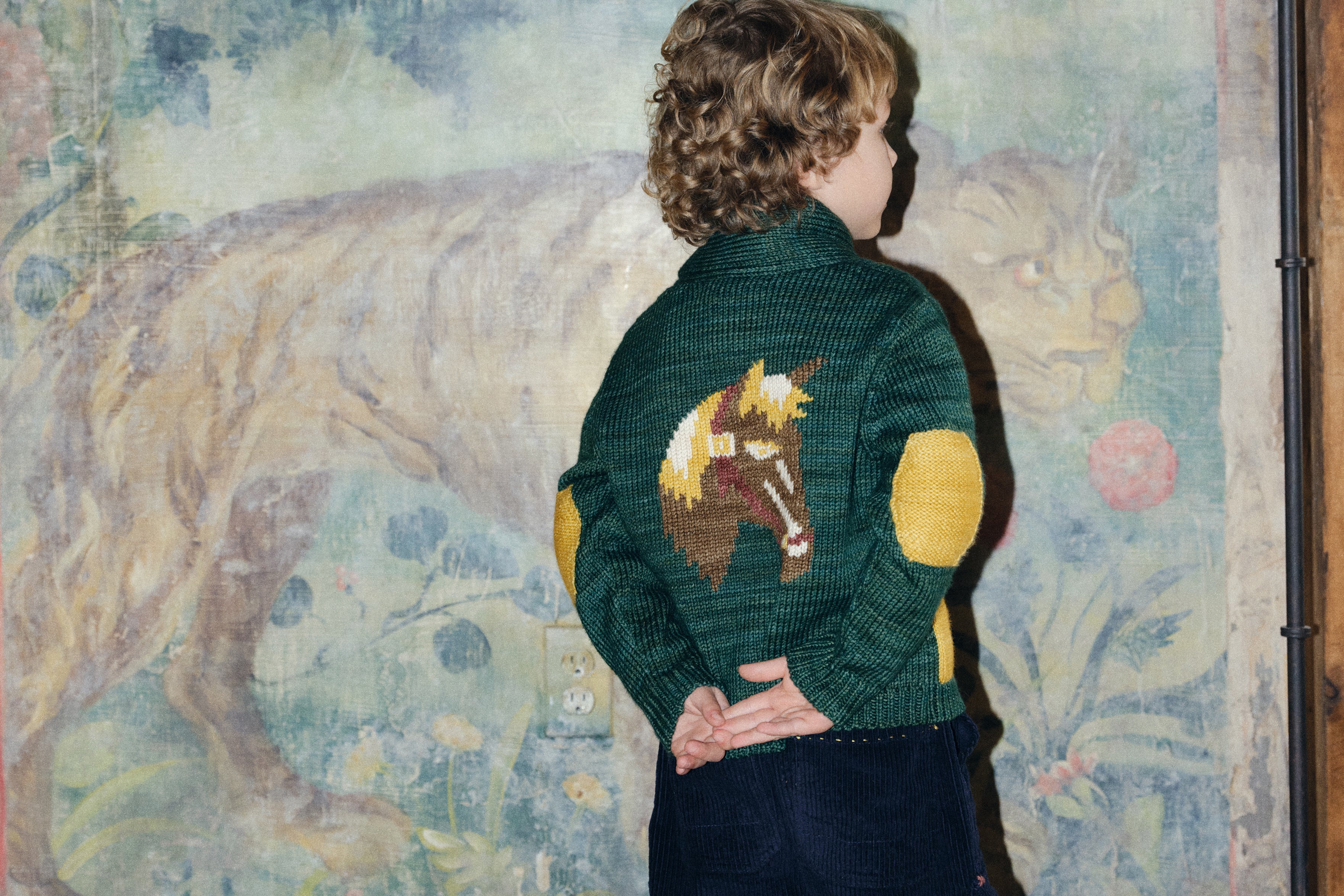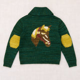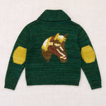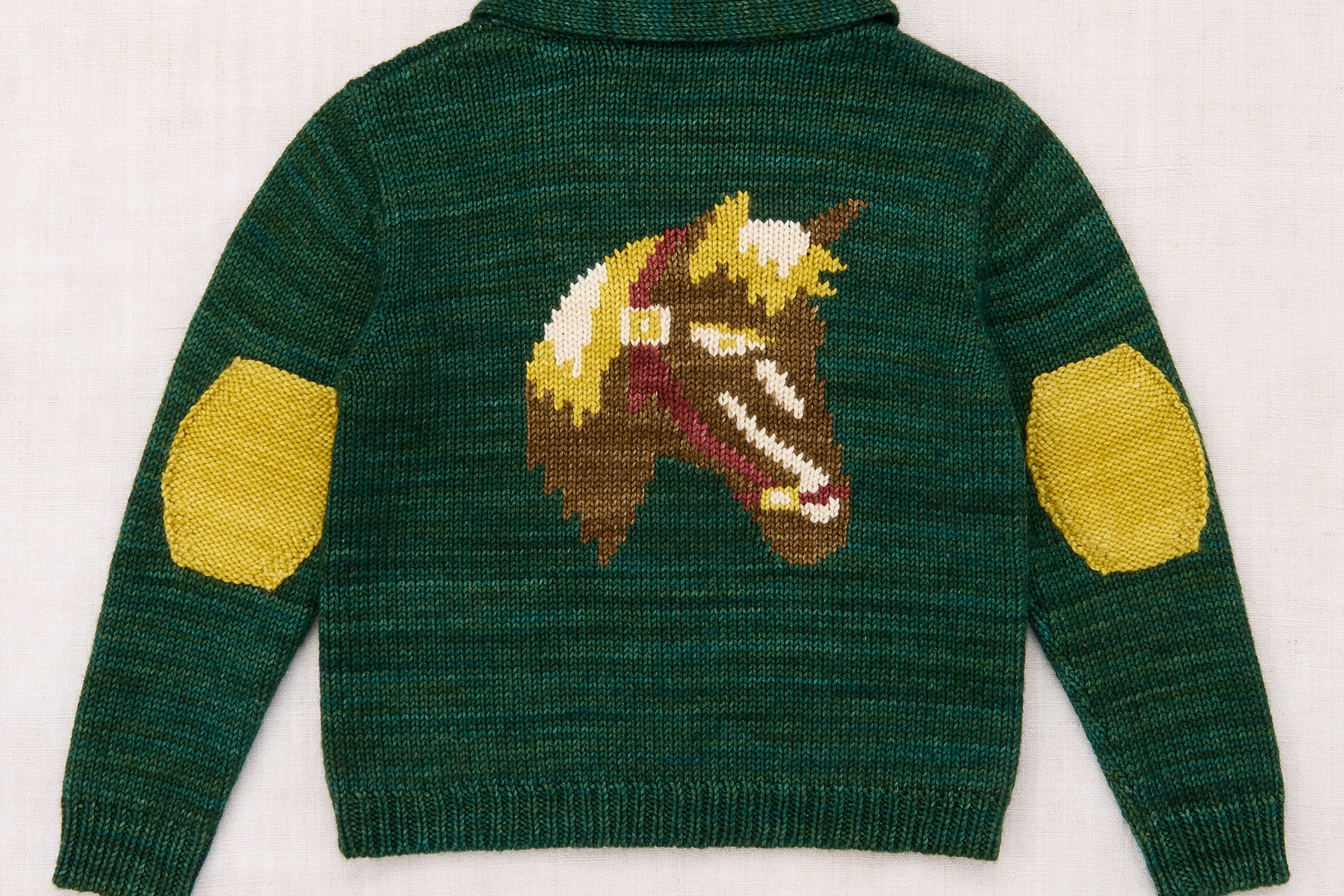A cardigan in Merino wool, featuring a shawl collar, special horse intarsia on the back, patch pockets with hand-embroidered Misha & Puff detail, elbow patches, ribbed trim, and a horn button closure.