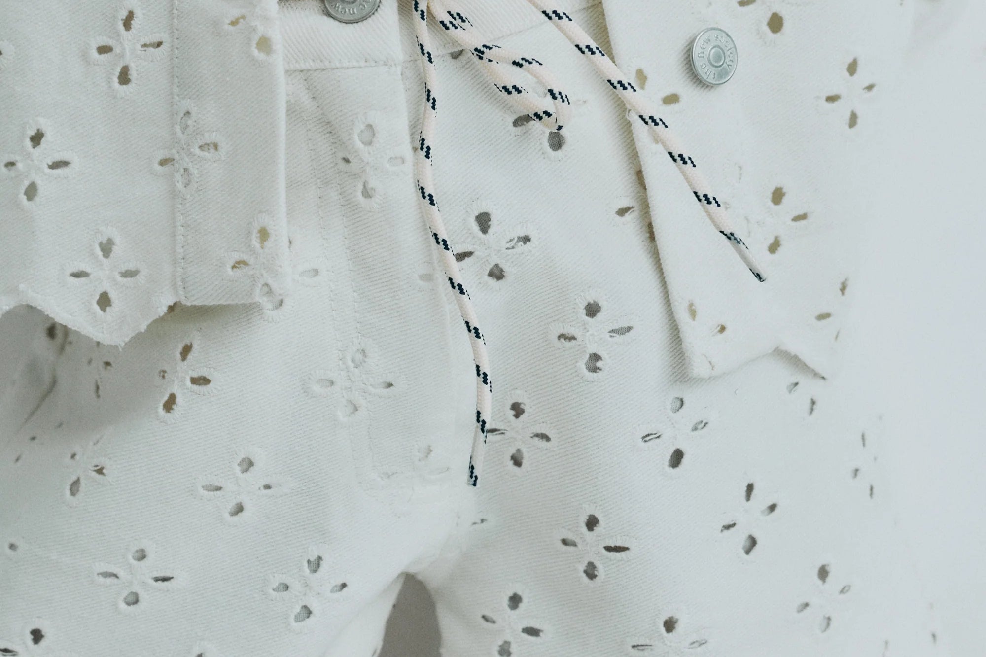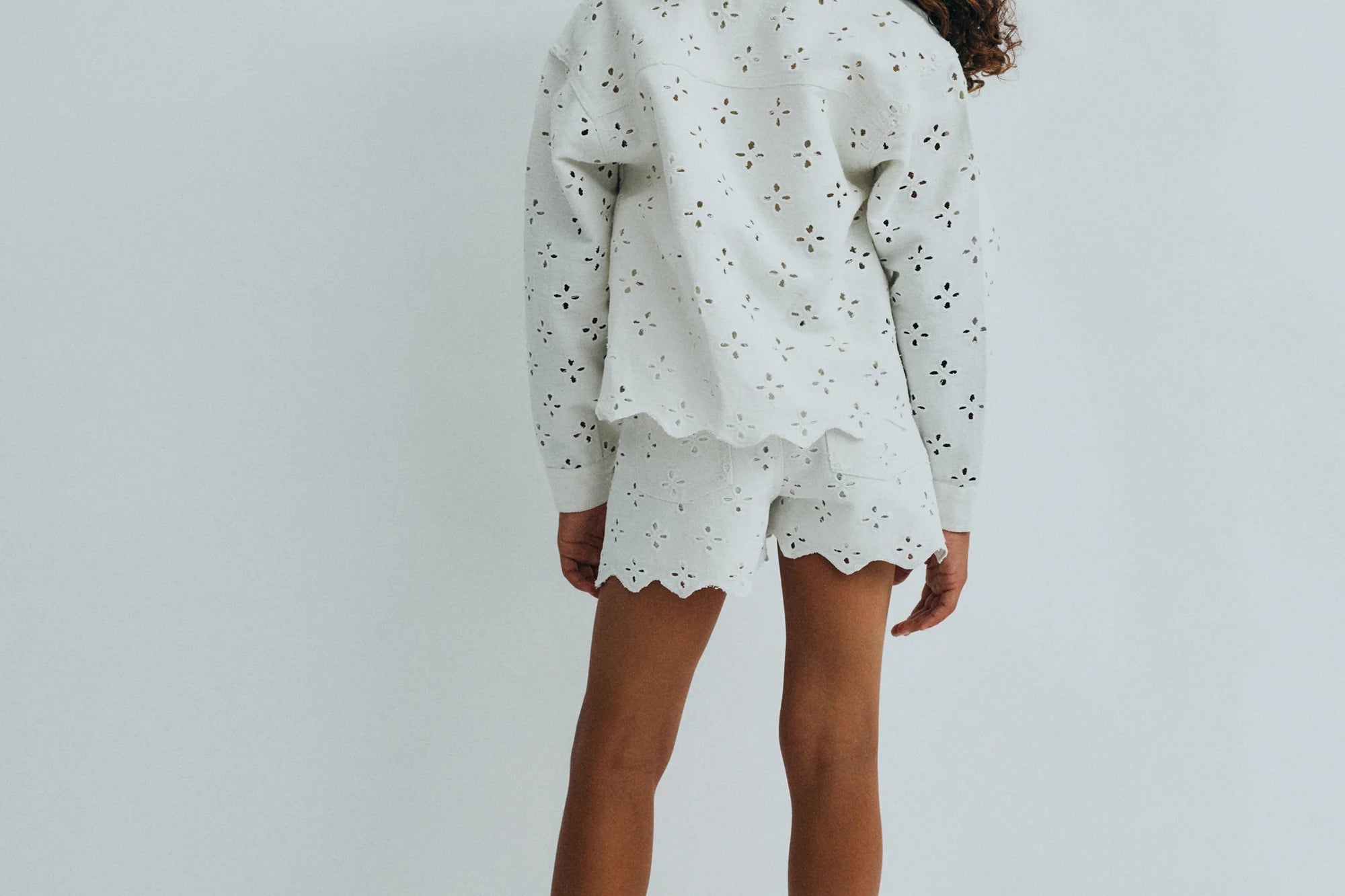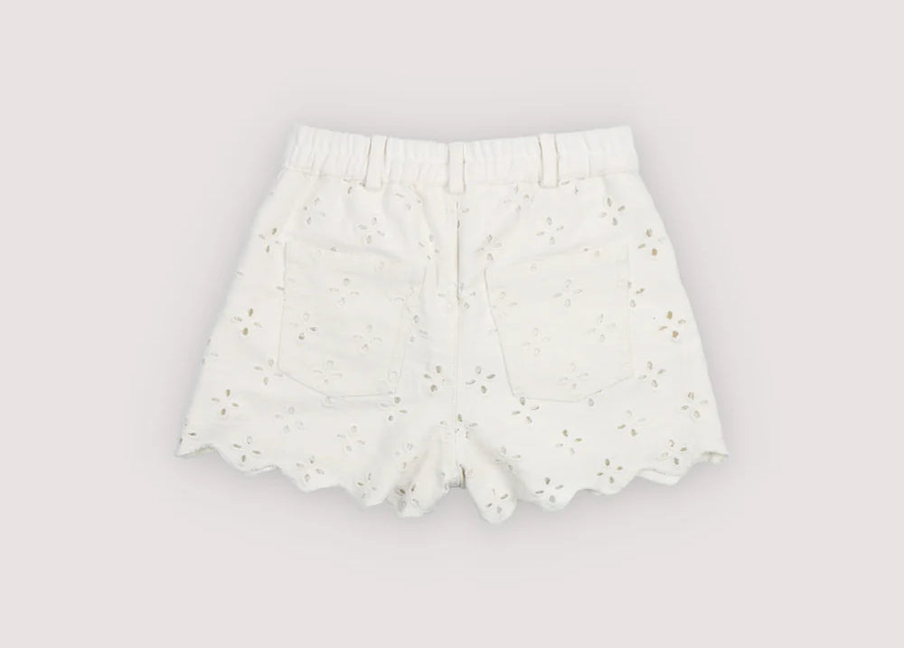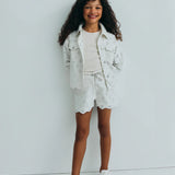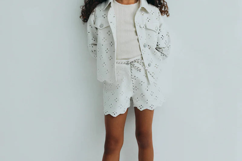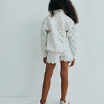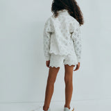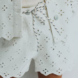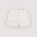 Denim shorts with a front opening, side and back pockets, crafted in a delicate denim fabric with all-over embroidery. Perfect for pairing with the matching jacket.