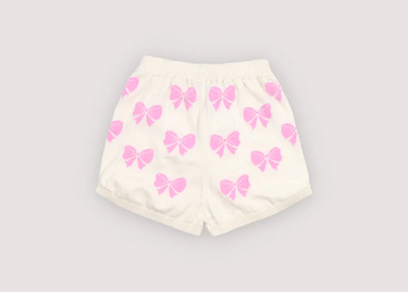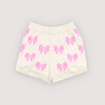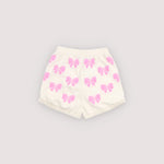 Fine cotton knit shorts with pretty pink bows. Elastic rib waistband and ribbed hems. Perfect to complete the look with the jumper.
