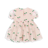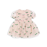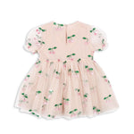 The Tullie dress has puff sleeves, a ruched top part with sheer tulle, and a voluminous skirt. Made from 100% polyester with a soft 100% cotton lining.