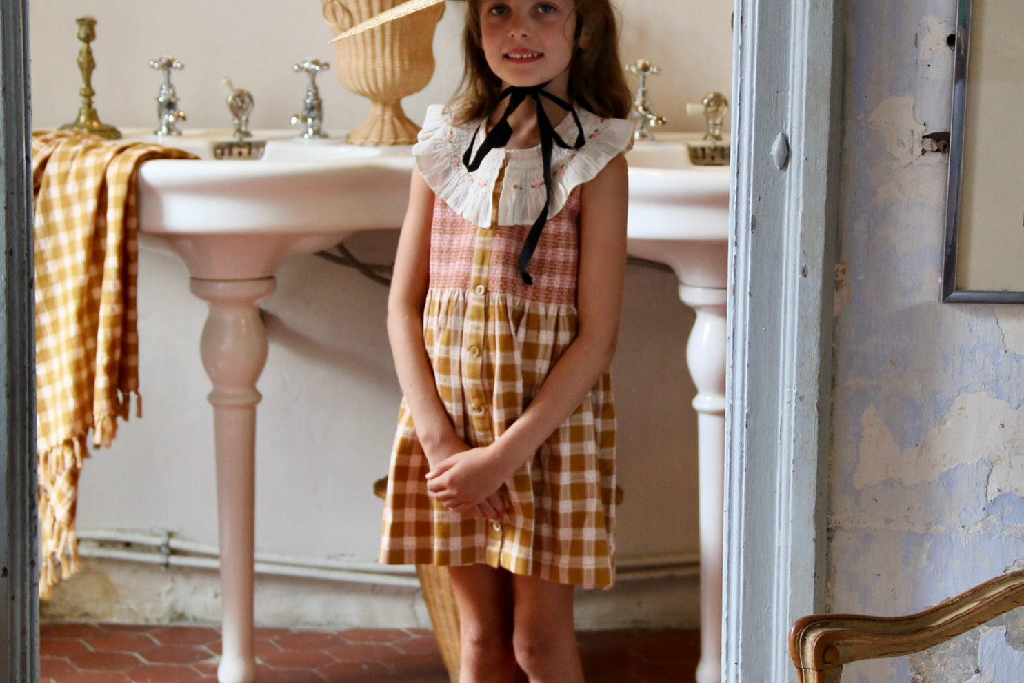 ruffled collar and hand-embroidered smocking