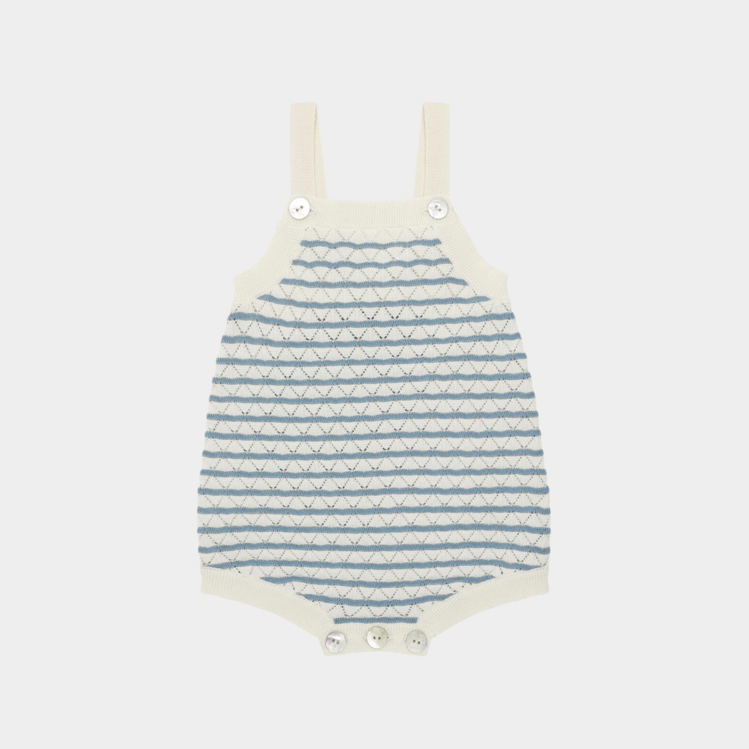 Made from soft organic cotton, this baby romper is designed with rib trims, braces, and closure with pearl shell buttons. The braces are crossed at the back and can be adjusted in two different lengths. The romper is knitted in a pointelle pattern with contrast stripes.