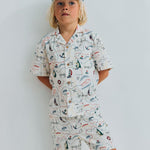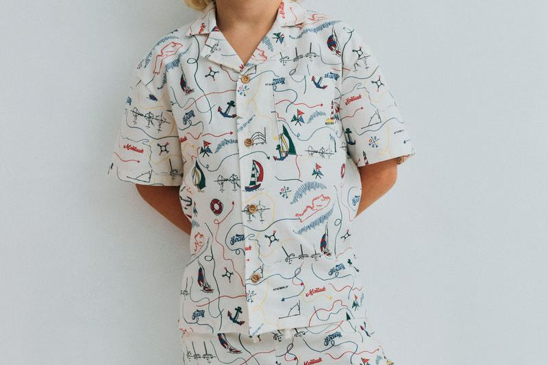 Soft cotton bermuda shorts featuring a unique multicolor map print and an adjustable drawstring waistband for a comfortable, tailored fit.